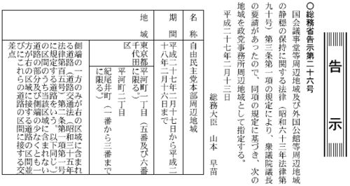 20141021に国会議事堂等周辺地域及び外国公館等周辺地域の静穏の保持に関する法律の規定により、政党事務所周辺地域を指定する件で民主党法部地域でのでも禁止の通達があったと報告したのだけど、2月13日に自民党本部周辺地域でも同じことをしていた。 官報2…