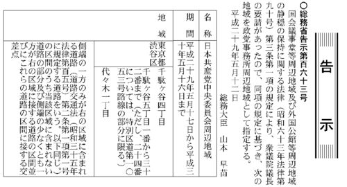 5月12日の官報だけど、国会議事堂等周辺地域及び外国公館等周辺地域の静穏の保持に関する法律による指定地域の告示があった。何件か溜まったらまとめようかと思ったのだけど、次が来ないうちに別の話題が官報に乗っていたので一緒に載せることにした。 それ…