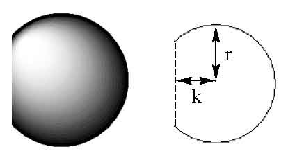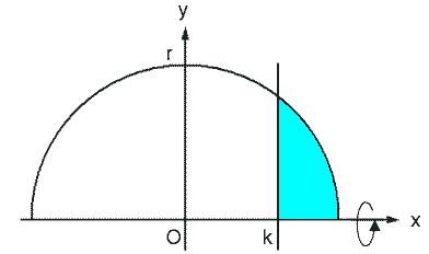 球体の端を切るので x=k の位置で円を切断し、切断した先の体積を求めて、球全体から引く方向で計算する。