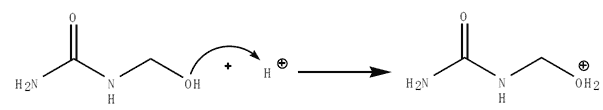 ⑤ プロトン化した水酸基に電子を引っ張られたことで電子密度の低くなった隣の炭素に別のメチロール化尿素のアミノ基が攻撃し、プロトン化水酸基は共有結合していた電子を引き連れて水となって脱離する。