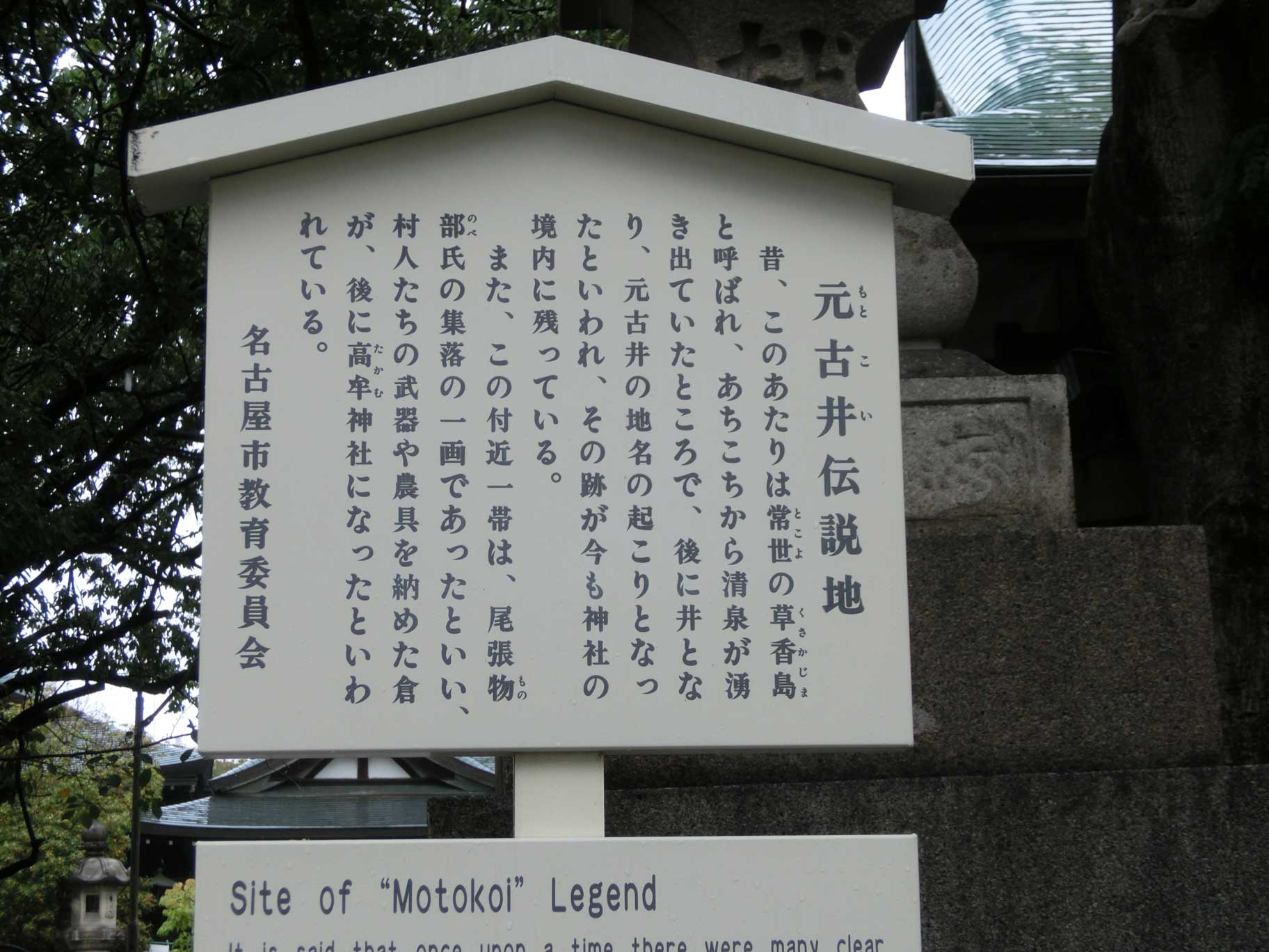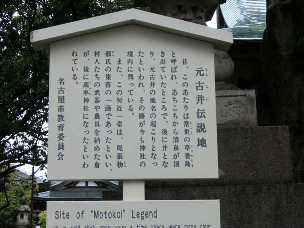 元古井伝説地 昔、この辺りは常世の草香島と呼ばれ、あちこちから清泉が湧き出ていたところで、後に井となり、元古井の地名の起こりとなったといわれ、その跡が今も神社の境内に残っている。 また、この付近一帯は、尾張物部氏の集落の一角であったといい、村人たちの武器や農具を収めた倉が、後に高牟神社になったといわれている。 名古屋市教育委員会 |