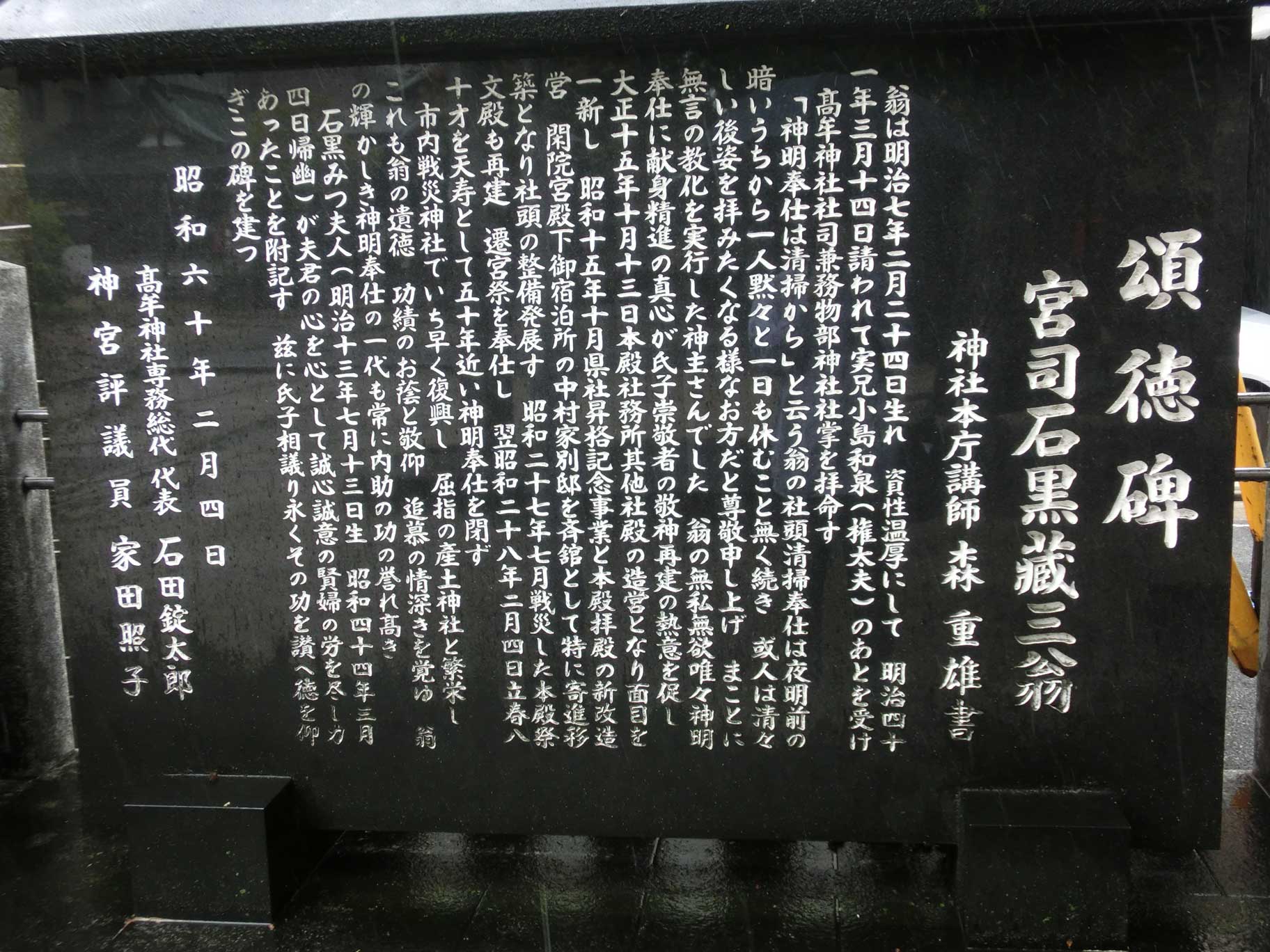 頌徳碑 宮司石黒黒藏三翁 神社本庁講師 森茂雄書 翁は明治7年2月24日生れ 資性温厚にして 明治41年3月14日請われて実兄小島和泉(権太夫)のあとを受け 高牟神社社司兼務物部神社社掌を拝命す 「神明奉仕は清掃から」と云う翁の社頭清掃奉仕は夜明前の暗いうちから一人黙々と一日も休むことなく続き 或人は清々しい後ろ姿を拝みたくなるようなお方だと尊敬申し上げ まことに無言の教化を実行した神主さんでした 翁の無私無欲唯々神明奉仕に献身精進の真心が氏子崇敬者の敬神再建の熱意を促し 大正15年10月13日本殿社務所其他社殿の造営となり面目を一新し 昭和15年10月県社昇格記念事業と本殿拝殿の新改造営 閑院宮殿下御宿泊所の中村家別邸を斉舘として特に寄進移築となり社頭の整備発展す 昭和27年7月戦災した本殿祭文殿も再建 遷宮祭を奉仕し 翌昭和28年2月4日立春八十歳を天寿として50年近い神明奉仕を閉ず 指内戦災神社でいち早く復興し 屈指の産土神社と繁栄し これも翁の遺徳 功績のお蔭と敬仰 追慕の情深きを覚ゆ 翁の輝かしき神明奉仕の一代も常に内助の功の誉れ高き 石黒みつ婦人(明治13年7月13日生 昭和44年3月4日帰幽)が夫君の心を心として誠心誠意の件婦の労を尽くし力あったことを付記す 茲に氏子相議り永くその功を讃へ徳を仰ぎこの碑を建つ 昭和60年2月4日 高牟神社専務総代 代表 石田錠太郎 神宮評議員 家田照子 |