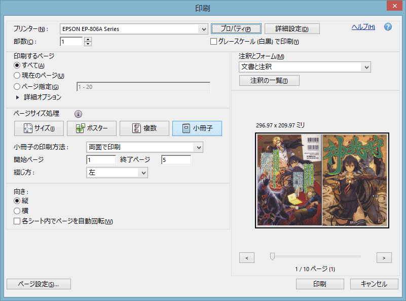 最近のプリンタでは、PIXUS iP2700みたいな廉価モデルでもなければ大抵は両面印刷とかいった機能が付いている。我が家のクソプリンタ EP-806ABでは下のような印刷設定画面で「小冊子」を選択することで冊子を作ることができる。