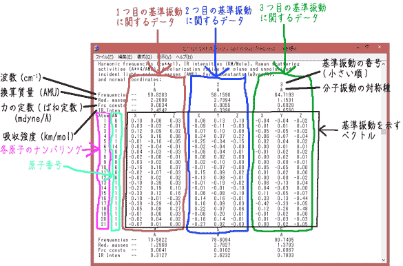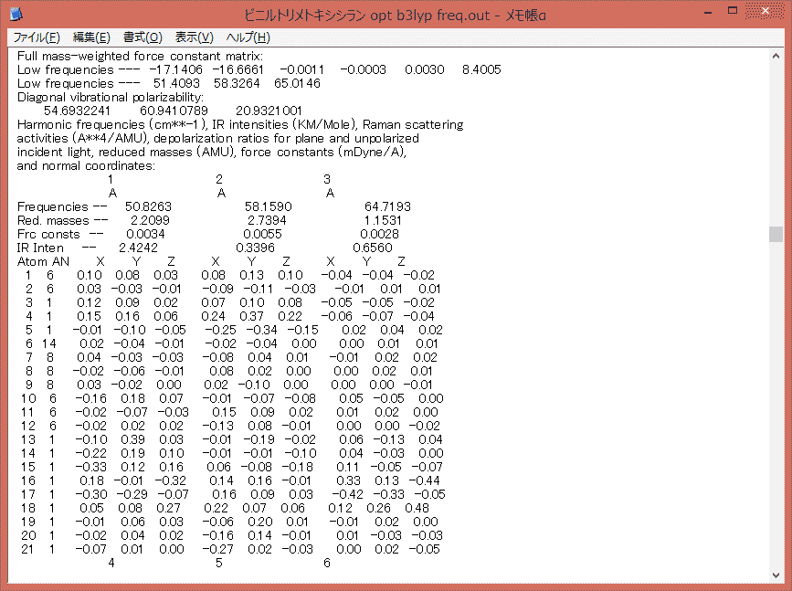 まずここで確認しておかなければならないのが、虚数振動がないこと。安定化構造ではないとエネルギー勾配が生じることで原子が一定以上のベクトルを持ち振動とならず、結果として虚数値を示すことになる。現実世界では虚数振動なんていう現象は存在せず、振動数を求めるための計算上の都合で現れるだけなのであるが、求めたい値が得られないことには変わりない。正常な結果が得られないことを意味する。その場合は"Low frequencies"とか書いてある下に"imaginary frequencies (negative Signs)"とか行った文言が入ってくる。虚数振動がある場合は、構造最適化をやり直して正常な構造を求め直す必要がある。
