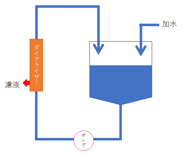 透析はやってることは濾過と同じであり、限外濾過とも呼ばれる。進めるに従い液量が減って濾過されない粒子が濃縮されていく。ダイアライザーによる透析は常に液を流し続けなければならないので、濃縮しすぎると都合が悪い。そこで、一定の濃度を保つように加水する。