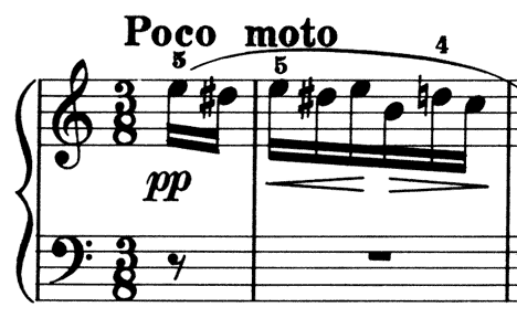 "Poco moto"という指示がある。"moto"というのはあまり聞かないけど、「動き」というような意味、英語のmotionに対応すると思う。"poco"は「ちょっとだけ」なので、合わせて「ちょっとだけ動きを伴って」という感じになる。速度じゃないやんってツッコミを受けそうだけど、速度の指示なんてそんなもんで、演奏者が勝手に解釈したら良いというものが多い。定量的な速度を指定したかったらメトロノームで示すからこれでよい。