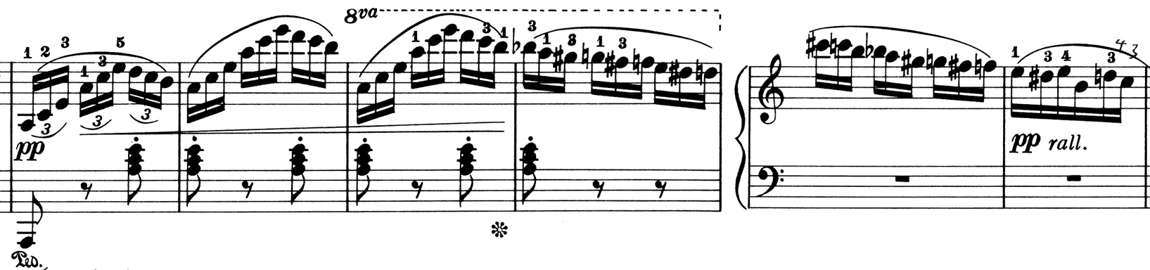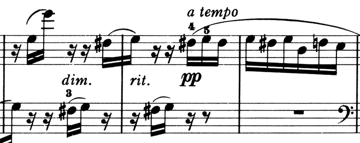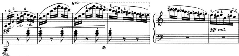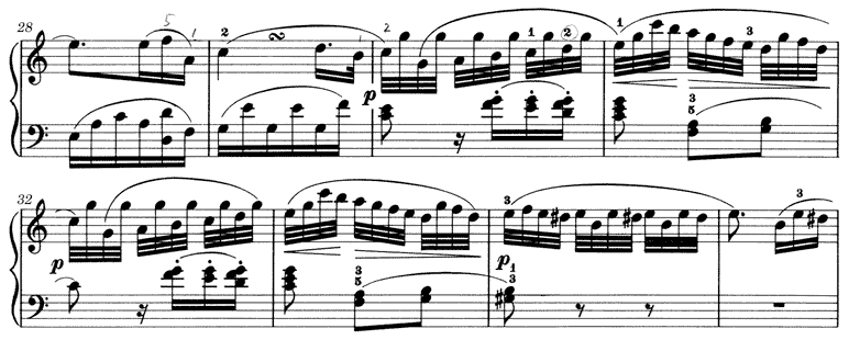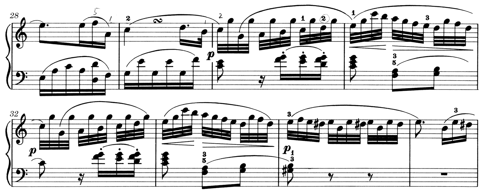 32分音符のパッセージで、メカニカル的にはここが最も難しくなる。とはいっても、せいぜい音が崩れやすいってくらいですごく速く弾こうって思わなければ特に苦労はないと思う。この部分を弾く速度で全体の速度を決めたら良いと思う。