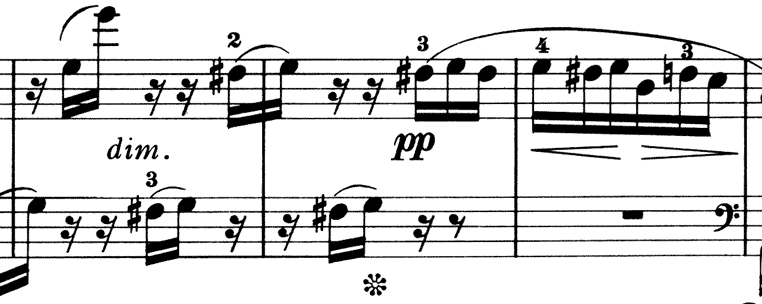 ②④⑥次に最もスタンダードな3箇所。Eのオクターブで手を変えて上昇した後に左(DisE)右(DisE)左(DisE)右(DisEDis)となる部分。これが13~15、50~52、94~96 ③最後の1つは36~38。例によって左(DisE)右(DisE)左(DisE)ときた後Disだけで主題に戻る。