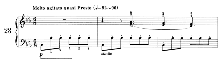 "Molto agitato quasi Presto(とても激しくほとんどプレスト)"ということで、とても速い。ゆっくり弾いても曲としては良いのだけど、練習曲としての効果を見込むのなら速くなければならない。全音版は付点四分音符で92~96bpmとなっているが、初版は126bpmと異常に速い。弾けないとは言わないけど、チェルニー30番と同様に無理にそこまで速くしなくてもいいじゃんかと思う。多大な時間を掛けて速度を上げるよりは、そこそこの速度で合格にして先に進んだほうが良い。それこそ92~96が適切じゃないかと思う。