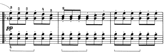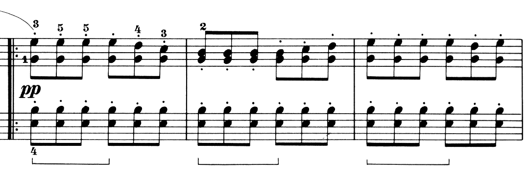 和音の連打は、スタッカートの音価、和音の各音の打鍵タイミング、リズムとテンポの保持、旋律の強調と気をつけるべき要素が多いのに加えて、ここではピアニシモで演奏しなければならないのでかなり難しい。多分、学習段階で全ての要素を高いレベルで完成させるのはあまり現実的ではなく、ある程度の完成度で見切りをつけて終了とすることになると思う。