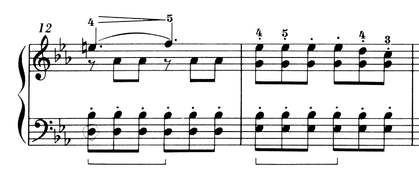 なお、主旋律が単音で独立しており、伴奏と少しくらいタイミングがずれても良いのだが、ずれるにしても粒を揃えるようにしてずれるようにしなければならない。旋律と伴奏でそれぞれ正しくリズムを刻む必要がある。