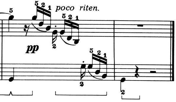 右手の強迫が休符になっているのは18番「気がかり」と同じタイプだけど、こちらのほうが弾きやすい感じがする。休符と言いつつも左手で旋律を補う形で埋めているので、音を途切れさせることがないため、正しい音価を迷うことがないためだと思う。